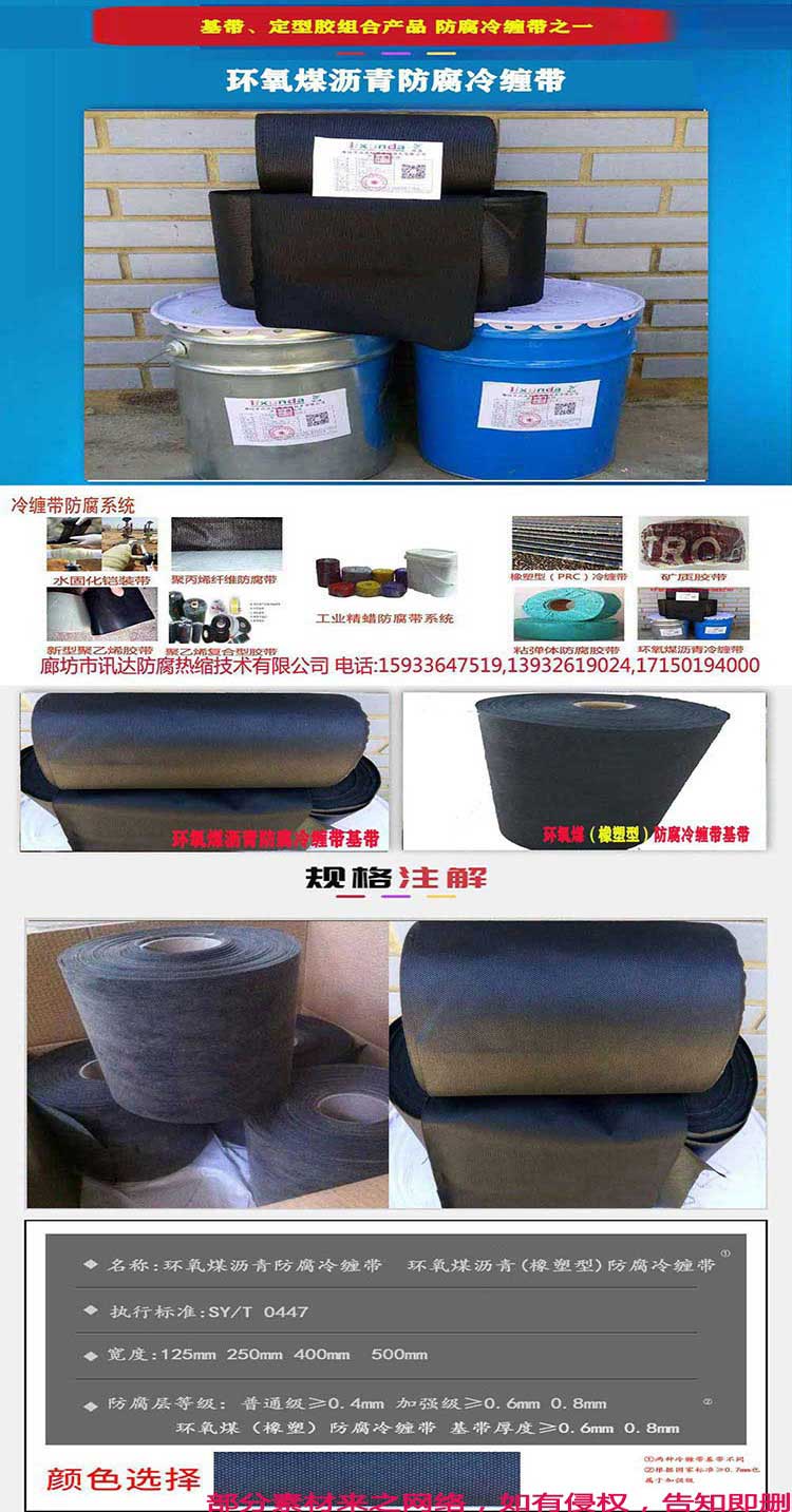 环氧煤沥青冷缠带分环氧煤沥青冷缠带和橡塑型环氧煤沥青冷缠带,两种胶带除基带不一样,环氧煤定型胶用量和施工方式都不一样,市场上很多客户都会把这两种冷缠带统称成环氧煤冷缠带。
